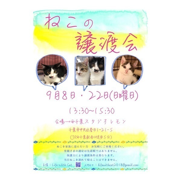 | イベント内容 | 個人ボラさんが愛情をかけて保護している大きな猫ちゃんや小さな猫ちゃんたちが ずっとのお家を求めて集まります。 ねこを家族に迎えたいとお考えの方 会場はアットホームな雰囲気ですので どうぞお気軽にご来場くださいね。 *里親さまの選定は先着順ではありません。 *保護主により譲渡条件は異なります。 *当日ねこちゃんを連れて帰ることは出来ません。 後日 保護主が里親様宅へお届けいたします。 *里親様に医療費のご負担をお願いしております。 第19回 Life With Cat『ねこの譲渡会』 9月8日(日曜日) 13:30~15:30 <会場> レンタルスタジオレモン 260-0033 千葉市中央区春日1丁目21-5 (JR西千葉駅/京成西登戸駅より徒歩4分) *駐車場のご用意はございません。 スタジオより徒歩1分圏内にコインパーキングが多数ありますので そちらをご利用ください。 ブログ→https://ameblo.jp/lifewithcat2018/ Facebook→https://www.facebook.com/lifewithcat2018/ メールでのお問い合わせ→lifewithcat2018@gmail.com |