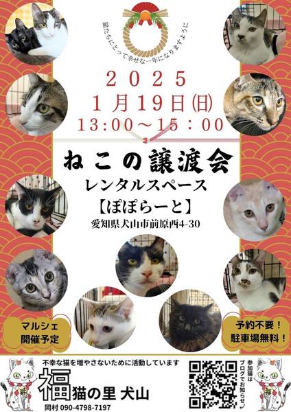 | イベント内容 | 【ココがポイント!】 ★ウイルスチェックなど健康診断済み! 【日時】 1月19日(日)13~15時 【場所】 レンタルスペースぽぽらーと (犬山市前原西4丁目30) 予約不要 広々駐車場あり 福猫の里 犬山「福猫の里便り」 https://hukunekonosato.hatenablog.com 【お約束】 当日、会場での猫の引き渡しはしておりません。 後日ご自宅までお届けします。 お試し飼育(トライアル)を1週間〜2週間程して頂き、双方が納得の上で正式譲渡となります。 譲渡の際は、医療費(ワクチン代等)、活動協力費の負担をお願いしております。 ・ペット可のお住まい ・完全室内飼育、終生飼育 ・適切な医療措置 ・不妊手術の実施と報告等、お約束があります。 《 譲渡に関するお願い 》 ◎猫の負担を考え、東海3県で車移動が1時間以内にお住まいの方。(遠方の方はお断りしています。)※通行料がかかりましたらご負担頂く場合もあります。 ◎高齢者のみ世帯への譲渡はお断りしています。託せる方がいれば、一緒に来場下さい。 ◎譲渡は、無償ではありません。猫によって費用が違いますので保護主にお尋ね下さい。 |