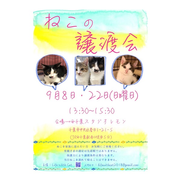 | イベント内容 | 個人ボラさんが愛情をかけて保護している大きな猫ちゃんや小さな猫ちゃんたちが ずっとのお家を求めて集まります。 ねこを家族に迎えたいとお考えの方 会場はアットホームな雰囲気ですので どうぞお気軽にご来場くださいね。 *里親さまの選定は先着順ではありません。 *保護主により譲渡条件は異なります。 *当日ねこちゃんを連れて帰ることは出来ません。 後日 保護主が里親様宅へお届けいたします。 *里親様に医療費のご負担をお願いしております。 第20回 Life With Cat『ねこの譲渡会』 9月22日(日曜日) 13:30~15:30 <会場> レンタルスタジオレモン 260-0033 千葉市中央区春日1丁目21-5 (JR西千葉駅/京成西登戸駅より徒歩4分) *駐車場のご用意はございません。 スタジオより徒歩1分圏内にコインパーキングが多数ありますので そちらをご利用ください。 ブログ→https://ameblo.jp/lifewithcat2018/ Facebook→https://www.facebook.com/lifewithcat2018/ メールでのお問い合わせ→lifewithcat2018@gmail.com |