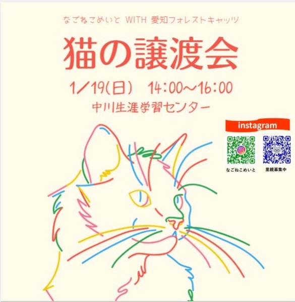 | イベント内容 | 日時 1月19日(日) 14時~16時 場所 中川生涯学習センター 主催 愛知フォレストキャッツwithなごねこめいと 地域猫活動やTNR活動の過程などで 保護した猫たち 子猫もいれば、大人猫もいます 見学、相談だけでも大丈夫! 予約不要、参加費無料なのでお気軽に 猫に関する活動を何かしたい、という方も歓迎です 遊びに来る感覚で、お越しくださいませ 来場者特典!は来てのお楽しみ! ☆猫に関して☆ 各団体の保護主さんごとに決めているお約束事があります ・当日は猫を連れ帰ることはできません ・猫を迎えるにあたり、飼育環境などについて お話しをさせていただきトライアル(お試し飼育) から始めさせていただきます ・2週間前後のトライアル期間を経て、問題ない ようであれば、譲渡契約書を結び正式譲渡と なります ・所定の譲渡費用をいただきます |