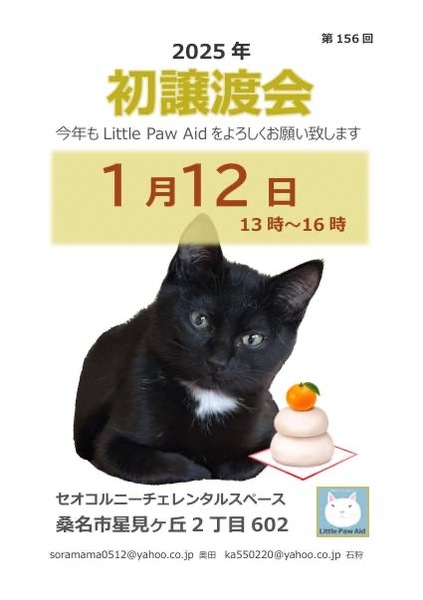 | イベント内容 | 日時 1月12日(日)13時~16時 場所 セオコルニーチェレンタルスペース 三重県桑名市星見ヶ丘2丁目602 猫は少ないですが子猫も参加します 慣れてない子もゴロゴロの甘えん坊もみんな個性的で可愛いです 猫を飼いたいと思っている方も猫を見てみたいと思っている方もお気軽に遊びに来て下さい それぞれの保護主により譲渡条件があります 当日猫を連れ帰る事はできません。 参加猫は保護主のブログで確認ください。 ◆参加者 リトルパウエイド https://blog.goo.ne.jp/ka550220/e/da0fa7f743a938b9030d35e95e0a0263 http://blog.livedoor.jp/cats_voice_pawaid/ ほんわか猫な日々 https://blog.goo.ne.jp/soramama はるごまいけのブログ http://ameblo.jp/harugoma3futagozaru/ 予約は不要です 連絡先 soramama0512@ezweb.ne.jp 奥田 |