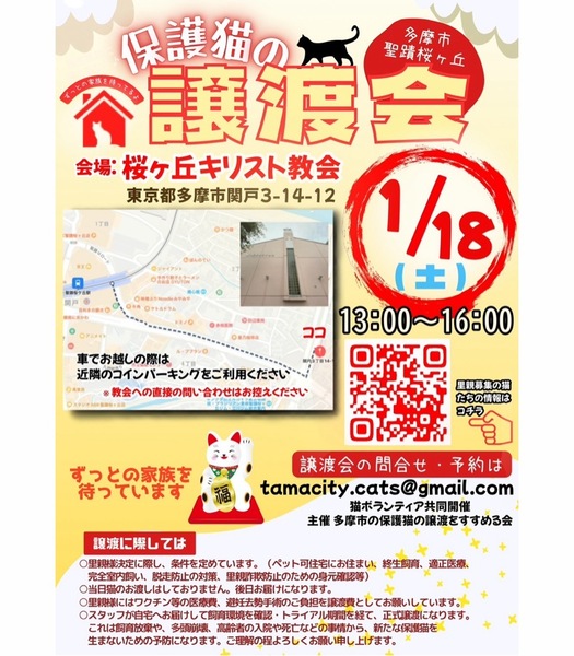 事情があって保護された猫さんたちが参加予定です。 チラシに付いてるQRコードまたはこちらのリンクから 猫たちの様子が見れます。 https://sites.google.com/view/cooneru/ 完全予約制ではありませんが、予約された方から優先的にご案内致します。 参加お申込み・お問合せは コチラ tamacity.cats@gmail.com 【日時】1月18日(土) 13:00〜16:00 【場所】桜ヶ丘キリスト教会 多摩市関戸3-14-12 (聖蹟桜ヶ丘駅徒歩8分) ※車でお越しの際は近隣のコインパーキングをご利用下さい。 【譲渡までの流れ】 ①譲渡会にて猫を決めたら預かりボランティアに話を聞く ②エントリーシートに記入 ③お届け(里親様宅へお伺いします) ④トライアル期間 ⑤誓約書を交わして本譲渡 【譲渡地域】 多摩市・府中市・日野市・八王子市・立川市・国立市・稲城市・相模原市・町田市・麻生区、他 【譲渡条件】 ①ペット可住宅にお住まいで、同居の方全員の了解がある。 ②経済的・体力的・時間的に猫を養える見込みがある ③完全室内飼い ④終生飼育 ⑤子猫の場合は留守にする時間が短いご家庭 ※単身者・高齢者の方には後見人必須 |
