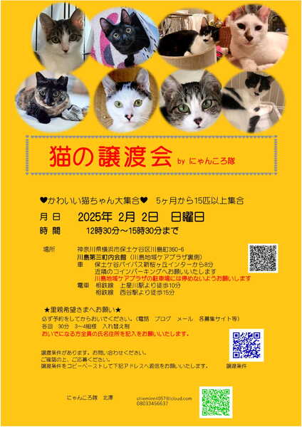 | イベント内容 | 猫ちゃんの譲渡会を開催いたします。 5ヶ月位からの猫さん15匹以上 大人猫さんも参加です。 月 日 2025年 2月2日 日曜日 時 間 12時30分~15時30分まで 場所 神奈川県横浜市保土ケ谷区川島町360-6 川島第三町内会館(川島地域ケアプラザ裏側) 車 保土ケ谷バイパス新桜ヶ丘インターから8分 近隣のコインパーキングにお願いいたします。 (手前にある川島地域ケアプラザの駐車場には停めないでください) 電車 相鉄線 上星川駅より徒歩10分 相鉄線 西谷駅より徒歩15分 ★里親希望さまへお願い★ 必ず予約をしてからおいでください。 各回 30分 3~4組様 おいでになる方全員の氏名住所を記入をお願いいたします。 譲渡条件があります。お問い合わせください。 ご確認の上、ご応募ください。 猫の譲渡について http://nyankorotai.blog.fc2.com/blog-category-5.html 上記の譲渡条件をコピーペーストして下記アドレスへ送ってください。 追ってご連絡いたします。 お電話にても受付いたします。 下記の譲渡条件を送ってくださっても大丈夫です。 ◆ご応募時に下記事項をお知らせください◆ 1.お名前、簡単な住所 2.先住動物の有無(ワクチン 不妊手術の有無等)と選んだ理由 3.家族構成(家族全員の年齢 関係 お仕事等) 4.住宅環境(一戸建て 分譲マンション 一戸建て賃貸 賃貸マンションペット可) 5.留守番の時間 6.下記の①~⑨までの同意 ◆応募者様へのお願い◆ ①一生涯、家族の一員としてくださる事(猫は20年生きます) ②完全室内飼いでお願いします。 (脱走防止対策をお願いします。ケージ 脱走防止扉 玄関窓等) ③不妊手術及び毎年のワクチン接種など健康管理 (不妊手術済のご連絡は必須) ④家族全員の同意があること ⑤ペット可住宅にお住まいであること。 (ペット不可にお住まいの方には譲渡できません) ⑥身分証明の提示及び誓約書を記入していただきます。 ⑦譲渡後の近況報告をしていただける方 ⑧譲渡費用等をご負担できる方 (初期医療行為は済ませてお届けします) ⑨ほとんどの猫さんがお外から保護した子です。 その辺の事をご理解していただける方 猫が小さい場合はお留守番の短い家を希望します。 ケージのご用意をお願いいたします。 申し訳ありませんが先住動物さんが4匹以上のご家庭はお断りさせていただいております。 無職 学生 未成年の方からの申込は受け付けておりません。 ご家族に未就学児のいるお家及び高齢者の方は要相談 2匹一緒を優先させていただきます。 双方の条件が合った場合は譲渡会又は保護先にお見合にきていだだき成立後に自宅室内へお届けいたします。 この時期なので近くに方を優先させていただく事もあります。 ご予約お待ちしております。 にゃんころ隊 http://nyankorotai.blog.fc2.com 担当 北澤(にゃんころ隊) chieminn4057@icloud.com |