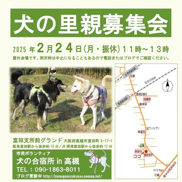| イベント内容 | ※屋外会場での里親募集会です。雨天時は中止にする可能性がありますので電話でご確認ください。 犬によっては別会場をご案内できる場合があります。 (電話でのお問合せ→090-1863-8011) ※先住ワンちゃんを連れて会いに来て頂けます。相性を見るためにも、是非是非、連れてきてください。 ※近付きましたら「犬の合宿所in高槻」のブログでも参加予定犬等の情報を紹介していきます。 予約は不要ですが、参加犬が直前に変更する場合がありますので、特に会いたいワンちゃんが決まっている場合は事前にご確認頂く方が確実かと思います。 【お問合せ】 090-1863-8011 ・・・・・・・・・・ 【アクセス】 ・阪急京都線 富田駅から徒歩約10分 ・JR京都線 摂津富田駅から徒歩約12分 ※隣接する富田支所と公民館の駐車場は使えませんが、会場広場内に駐車できる場合があります。 事前にご確認ください。(090-1863-8011) ・・・・・・・・・・ 市民ボランティア「犬の合宿所in高槻」は、現地での譲渡が難しい離島の保健所収容犬を引き取り関西で新しい飼い主探しをしています。 保護犬を家族として迎えることが文化として定着し、生体販売に伴う悲惨な繁殖犬の存在がなくなることを願っています。 ・・・・・・・・・・・・・・・・・・・・・・・・・・・・・ ★ 一時預かりさんや犬の搬送ボランティアさん、里親募集会の当日お手伝いの方など常時募集しています。 ★犬によっては個別お見合いできる場合があります。 里親募集会に参加できない方で個別お見合いをご希望の方は、預かりさんとの日程調整が必要ですので、電話でお問合せください。⇒090-1863-8011 |