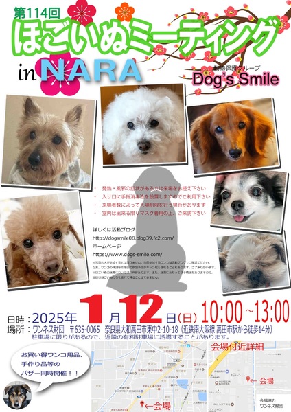 | イベント内容 | 明けましておめでとうございます。 1月12日(日曜日)10時~13時、奈良県大和高田市のワンネス財団エモーショナルリテラシーセンターをお借りして「第114回ほごいぬミーティングat奈良大和高田」を開催します。 保護犬を家族に迎えようと考えている方、保護犬に会ってみたい方、保護犬について知りたい方、ぜひご来場ください。 相性を見るためなど先住わんこさん、卒業わんこさんのご参加ももちろんOKです。 当日は、Dog's smileグッズやワンコ用品の販売、Dog's smileを応援してくださる方々が手作りされた手作り雑貨などの販売も行います。どれもお買い得です。 また、売り上げは、私たちの活動資金になります。ぜひご協力をお願いします。 来場者のみなさまには、感染症の予防に御協力をお願いします。 ・発熱・風邪の症状のある方の入場は御遠慮願います。 ・入場時は、手指消毒への御協力をお願いします。 ・来場者の状況により、入場制限を行う場合があります。 なお、来場予定のワンコについては、活動ブログでご確認ください。 日時 令和7年1月12日(日)午前10時~午後1時 場所 ワンネス財団エモーショナルリテラシーセンター 奈良県大和高田市東中2-10-18 (近鉄南大阪駅高田市駅から南に徒歩14分) 協力 ワンネス財団、株式会社松田電気工業 |