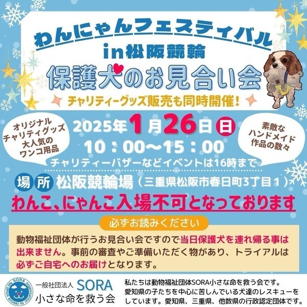 | イベント内容 | 三重県松阪市の松阪競輪場で開催されます、わんにゃんフェスティバルにて保護犬のお見合い会とチャリティーグッズ販売をさせていただきます。 ぜひ可愛い保護っ子達に会いに来て下さいね。 チャリティーグッズ販売の収益は、全て保護犬の医療など保護活動に使わせていただきます。 事前のお申込みは不要です。保護活動ブログで、開催日の数日前に譲渡会参加が決定したワンコたちのご案内もしておりますので、ご希望のワンニの参加をご確認してお越し頂けますと幸いです。 お見合い会は15:00までですが、チャリティーグッズ販売は16:00までとなります。 SORA公式ホームページ https://sora-chiisana.org/foster/ SORA公式活動メインブログ https://ameblo.jp/sora-chiisana-inochi/ SORAイベントブログ https://ameblo.jp/sora-charity-events/ |