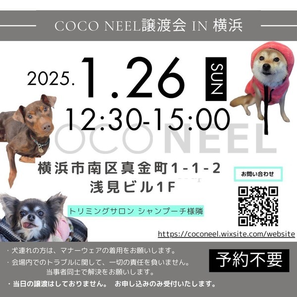 | イベント内容 | ・ ・ COCO NEEL 譲渡会 @横浜 2025.1.26(日)12:30〜 15:00 ⚠参加犬は決まり次第お知らせします- ̗̀? ━━━━━━━━━━━━━━━ ?会場 横浜市南区真金町1-1-2 浅見ビル1F ?️の用意はありません? 近隣のコインパーキングのご利用をお願いいたします。 ????市営地下鉄ブルーライン阪東橋駅1A出口より徒歩10分 ━━━━━━━━━━━━━━━ 会場にてお見合いをご希望の方は、譲渡条件をよくご確認のうえ、里親希望エントリーフォームより事前エントリーお願いします。 詳細はHP、ブログからご確認ください。 ━━━━━━━━━━━━━━━ ?COCO NEELオリジナル チャリティーグッズを譲渡会特別価格にて販売します! ※売上は保護っ子達の医療費・活動費として大切にお預かりさせていただきます?♀️ ご協力お願いいたします。 ━━━━━━━━━━━━━━━ ⚠お願い⚠ ・ワンコ連れの方はマナーウェアの着用をお願いします。 ━━━━━━━━━━━━━━━ #お問い合わせはhpからお願いします #コメントDM対応しておりません ━━━━━━━━━━━━━━━ #coconeel #coconeel保護犬 #ココニール #ここにいる #保護犬 #里親募集 #里親募集中 #譲渡会 |