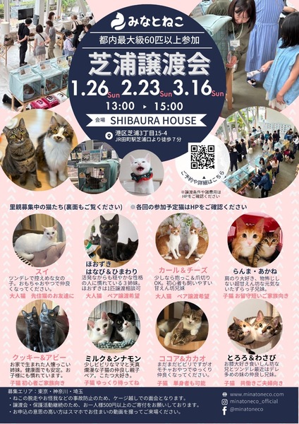 | イベント内容 | みなとねこが毎月定期開催している譲渡会です 2024年も譲渡会を通じて331匹もの猫を186家庭にご縁を繋ぐことができました ご来場予約の上お越しいただきますとスムーズにご案内できます。 ご予約はみなとねこのHPよりお願いします https://www.minatoneco.com/event 参加猫の詳細はこちら https://www.minatoneco.com/event/shibaura ※参加猫たちの様子はみなとねこの各種SNSもご覧ください https://linktr.ee/minatoneco?utm_source=linktree_profile_share<sid=9dad9d43-538a-4e5f-a13e-d9808a3673d0 ーーー 会場は明るく開放的な雰囲気です Youtube「みなとねこ譲渡会に行ってみよう」 https://youtu.be/8Q4Gti1swQk 25ケージ 60匹ほどの参加となりますが、それ以外の預かり宅の猫もご紹介可能です 子猫は2匹ペアでの譲渡が原則です 初めての方こそ最初から2匹をお勧めしています また私たちボランティアは、ご縁のあった猫たちに終生里親様に愛されて幸せに安全に暮らして欲しいと願っています このため里親になっていただくにはいくつかの条件やお約束事があります。 ◆基本条件(猫それぞれ、保護主により異なります) ・ご家族全員が飼育に賛成であること ・ペット可物件での完全室内飼い、エアコンなどによる室温管理、医師の指示に従い定期的な受診やワクチン接種、 適切な時期(生後4ヶ月中)での避妊去勢、病気予防に配慮したフードの選択、終生飼養をお願いしております。 ・ケージのみの飼育、リビング以外の一室のみでの飼育は不可です。十分な運動のスペースと窓から景色が眺められのんびり日向ぼっこが可能な環境が望ましいと考えています。 ・誤食などの事故防止のため、お部屋の整理整頓や脱走防止にも万全の対策をお願いします。 ・換気が十分でない室内での喫煙をされる方はお断りしております。 ・日々のお世話だけでなく、スキンシップが可能な精神的・時間的・経済的な余裕がある方に限らせていただきます。猫が20年以上生きる中でなるべく変わらぬ環境で愛情を注いで頂けるよう、家族構成やお仕事、お住まいに変化のない方を優先させていただきます。 またお届けやフォローの都合上、募集エリアも東京、神奈川、埼玉に限らせていただいております。 ■里親申込書類一式はみなとねこHPよりダウンロードをお願いします https://www.minatoneco.com/foster-entry 会場では里親申込書を拝見して簡単な面談を行います 会場にてご記入いただくことも可能ですが、面談希望の方が多いとお待ちいただくことになりますので、お手元で印刷していただきご記入の上ご来場いただくことをおすすめしております ※ご家族にアレルギーがある方、喫煙者がいる場合には是非事前にご相談ください ※猫と暮らしたことのない未就学児がいらっしゃる場合には事前にアレルギー検査などお勧めします 実際の参加予定猫 1/25(土)21:00までにみなとねこのHPやFacebookページでご紹介します https://m.facebook.com/minatoneco/ 直接ご応募の方は詳細をLINEなどでやりとりの上で預かり宅でのお見合いも行っております そうした中で譲渡会前に里親様が決定することもございますことご了承ください ※予約優先、30分入替制、混雑時は入場をお待ちいただくなどのご協力をお願いしております ※換気のためにドアをオープンしての開催のためにケージ越しでのご対面となりますことご理解ください ※譲渡会の開催や保護活動の継続のため、お一人様500円以上のご寄付をお願いしております |