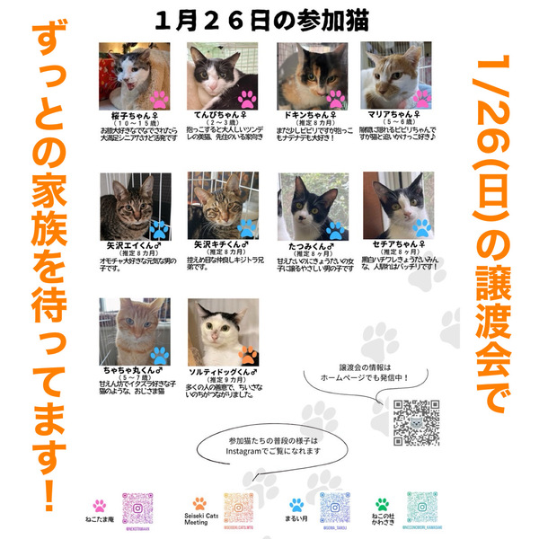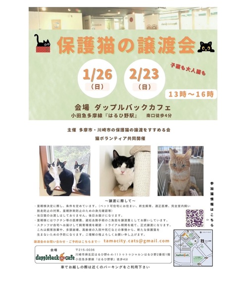| イベント内容 | 【麻生区はるひ野】保護猫譲渡会 【日時】12月22日(日)13:00-16:00 【会場】ダップルバックカフェ カフェ隣のお部屋になります 【住所】神奈川県川崎市麻生区はるひ野4-4-11 トゥトゥジャルダンはるひ野二番街1F(小田急多摩線「はるひ野駅」南口から徒歩約2分 京王線「若葉台駅」から徒歩16分) 【ご予約お問い合わせ】tamacity.cats@gmail.com ※完全予約制ではございませんが ご予約の方優先でご案内させていただきます。 予約の際はお時間指定していただけると助かります。 ※車でお越しの際は 近隣のコインパーキングをご利用下さい?️ ※お店への直接のお問い合わせはお控え下さい 見学希望の方や お迎えを検討中の方 物資の支援、ご寄付なども ぜひぜひお気軽にお越しください?? 素敵な出会い待ってます? 【譲渡までの流れ】 ①譲渡会にて猫を決めたら預かりボランティアに話を聞く ②エントリーシートに記入 ③お届け(里親様宅へお伺いします) ④トライアル期間 ⑤誓約書を交わして本譲渡 【譲渡地域】 多摩市・府中市・日野市・八王子市・立川市・国立市・稲城市・相模原市・町田市・麻生区,他(片道1時間程度) 【譲渡条件】 ①ペット可住宅にお住まいで、同居の方全員の了解がある。 ②経済的・体力的・時間的に猫を養える見込みがある ③完全室内飼い ④終生飼育 ⑤子猫の場合は留守にする時間が短いご家庭 ※単身者・高齢者の方には後見人必須 |