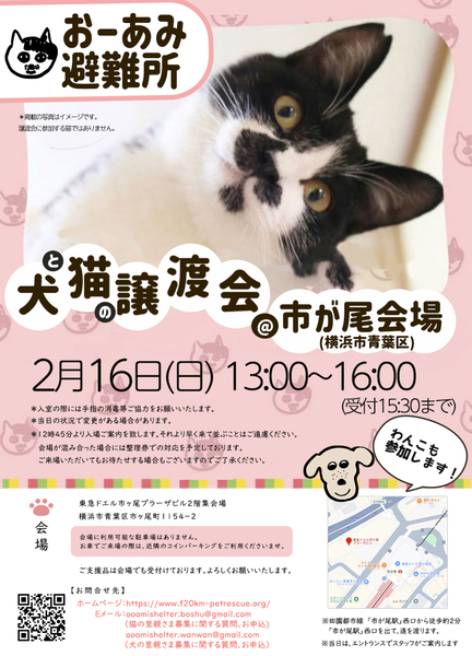| イベント内容 | ☆★☆★☆★☆★☆★☆★☆★☆★☆★☆★☆★☆★☆ ~2月16日(日)市ヶ尾にて譲渡会開催!~ ◎場所・・「東急ドエル市ヶ尾プラーザビル2階集会場」 神奈川県横浜市青葉区市ヶ尾町1154-2 田園都市線「市ヶ尾」駅西口より徒歩約2分 ◎日程・・2月16日(日)(雨天決行) ◎時間・・13時から16時(受付は15時30分まで) (会場に利用可能な駐車場はございません。近隣のコインパーキングをご利用ください。) *12時45分より入場ご案内を致します。それより早く来て並ぶ事はご遠慮下さい。 *参加の際は、アルコール消毒のご協力をお願いいたします。 *混雑状況により、入場制限をさせていただく場合がございます。 ※参加予定の犬猫は体調により参加できない場合があります。ご了承ください。 ☆★☆★☆★☆★☆★☆★☆★☆★☆★☆★☆★☆★☆ |