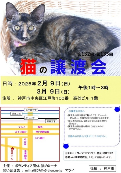 | イベント内容 | 昨年生まれた4~5ヶ月の子猫も参加します!落ち着いた大人猫さんも参加します。 どちらもエエ子ですので、可愛い姿を見に来てください 猫たちがこれからも幸せになるために、新しい家族を探しています(=^・^=) 猫は後日こちらからお届けをさせて頂き、お家の環境を見せて頂ければと思います。 仔猫は20年くらい生きる子もいますので、ご自身の年齢に合った猫さんとの出会いを探しに来てください。 ペット不可にお住まいの方はご遠慮ください!(ご確認してください。) 譲渡には条件が多数ありますので、ご理解くださいませ<m(__)m>。 まずはお試し(トライアル)で猫との相性を見てから、1ヶ月後に正式譲渡となります。 また、猫を保護して里親を探そうと思われている保護者の方も、〖参加猫の募集〗をしていますので、お申し込みくださいね! アドレス miina0807@y5.dion.ne.jp にご連絡をください。 お越しの際は各路線の三宮駅からは徒歩10分くらい、車でお越しの場合は近隣のコインパーキングなどにお停めください。 当日、体調の悪い方、発熱がある方、このような方はご遠慮ください。 定例の毎月は第2日曜日に譲渡会を開催しておりますので、次回の出会いに期待をしてくださいね。 ブログ: 猫のミーナといっしょ http://miina300.blog.fc2.com/ インスタ:nekono_mina |