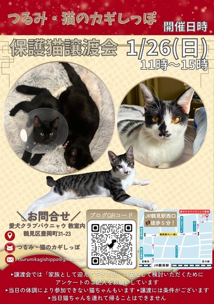 | イベント内容 | 1月26日(日)つるみ・猫のカギしっぽ 定例譲渡会を開催いたします 横浜市鶴見区豊岡町31-23 愛犬クラブバウニャウ 教室内 午前11時~午後3時 お問い合わせ先: tsurumikagishippo@gmail.com 予約は不用です 感染予防のため: ①室内ではマスクを着用していただきます ②入場時にアンケートをご記入いただきます (連絡先等を含む) お問合せは会のメールアドレスにお願いいたします。 tsurumikagishippo@gmail.com 会の譲渡条件をあらかじめ御覧くださいませ (ブログ右上に「ご確認ください」とあります) |