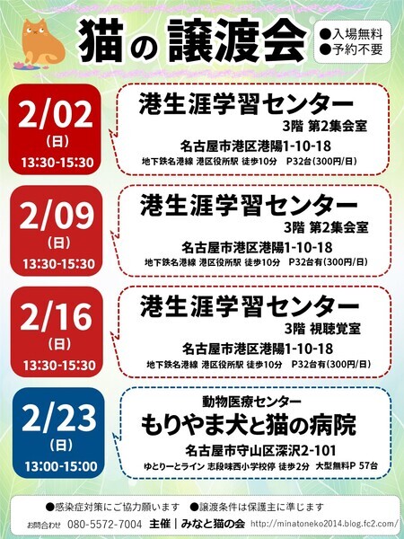 | イベント内容 | 【人も猫も幸せになれる】 譲渡会は、猫と人の出会いの場。猫たちは、あなたの愛情をたくさん受けて、心身ともに成長していきます。ぜひ、譲渡会で、あなただけの特別な猫を見つけてください。無理な譲渡はせず、人と猫の幸せな未来を応援します。 ●会場は ・大型無料駐車場有 ・予約不要&入場無料 ●参加猫一覧 http://minatoneko2014.blog.fc2.com/blog-entry-1829.html ●参加猫は ・子猫も成猫も全頭ワクチン接種済 ・ノミダニ駆除済 ・トイレ躾済 ・ケージレストのトレーニング済 ●参加する猫たちについて 基本治療やトイレのしつけは済んでいます 足りないのは共に生きる新しい家族だけです 「譲渡会は行ったことがなくて不安…」 「猫を飼うのははじめて」 「今すぐじゃないけどいずれ猫と暮らしたい」 そんな皆様も大歓迎! ●譲渡に関して ※完全室内飼い・誓約書・治療費負担等の 諸条件があります。 ※譲渡やトライアルに関する契約条件は 猫の保護主によって異なります。 ●譲渡会その他についての問い合わせは みなと猫の会 minatonekonokai@gmail.com 080-5572-7004 までお願いします。 ♪参加猫ちょこっと紹介 写真2枚目 ふわちゃん ♀ 10才 人が好きな長毛シニア猫 他の猫とは相性があるようです お留守番もしっかりできます 譲渡の流れなど詳しくは主催者ブログ ・みなと猫の会 ~こぴっと猫だより~ http://minatoneko2014.blog.fc2.com/ |