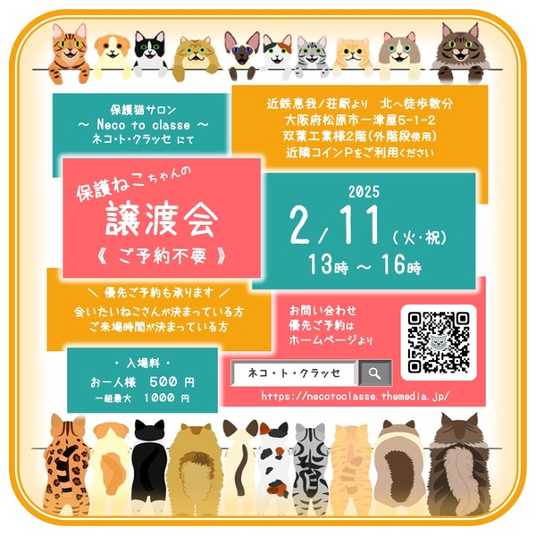 | イベント内容 | \\ ご予約不要 // 会いたい猫さんが決まっている方やご来場時間が決まっている方は優先的にご案内をさせていただきますので、ホームページよりご予約ください。 参加猫さんもホームページからご確認ください。 https://necotoclasse.themedia.jp/ (Google等で「ネコトクラッセ」で検索できます) ※ 各猫さんの募集ページのタイトルに「◆1/13◆」と書かれた猫さんが参加します。 ※ 参加猫さんは順次お知らせしていきますが、譲渡会までにトライアルが決定したり体調不良などで不参加となる場合もございます。 ◇ 開催場所 ◇ 保護猫サロン ネコ・ト・クラッセ 大阪府松原市一津屋5-1-2 双葉工業株式会社様2階(外階段使用) 近鉄南大阪線恵我ノ荘駅から北へ徒歩約数分 (近隣コインパーキングをご利用ください) ◇ 当日のお願い事項 ◇ ・開催協力費としてお一人様 500円、1組最大 1000円 を頂戴しております。 ・猫さんの感染対策のため、入室時の手指消毒、靴下着用をお願いしております。 ・未成年、学生の方のみでのご来場はお断りしております。 ・先着順ではありません。また、当日連れて帰ることはできません。 ◇ 譲渡方法 ◇ ・後日ご自宅へのお届けとなります。その際、飼育環境、脱走防止策等の確認をさせて頂きます。 ・譲渡誓約書の取り交し、身分証明書のご提示(双方とも)をお願いしております。 ・トライアル期間(2週間程度)を経ての正式譲渡となります。 ◇ 譲渡条件 ◇ ・参加猫さんにはそれぞれ保護主様がおられ譲渡条件が異なりますが、下記は共通の条件となります。 (猫さんごとの詳細条件については、それぞれの募集ページをご確認ください) ・ペット飼育可住宅にお住まいの方。(犬や小動物のみの可の場合や頭数制限にご注意ください) ・ご家族全員の同意が得られている方。 ・仔猫さんの場合は、お留守番時間が短く(概ね3、4時間程度)少しの体調変化でもすぐに通院できる方。 ・トライアル期間中は頻繁に、譲渡後も折を見て状況報告をして下さる方。 ・完全室内飼い、ケージのご用意、脱走防止対策に最善を尽くして下さる方。 (ご想像以上に脱走したまま帰って来られなくなる猫さんが沢山います。玄関を開けた際の足下のすり抜けが非常に多いため、市販の柵やDIYで玄関ドアまで来られない対策をお願いしております。) |
