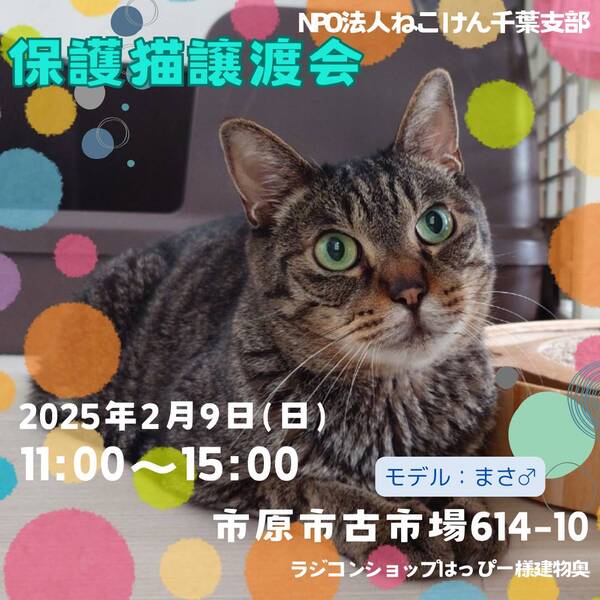 | イベント内容 | 毎回新入り子猫が登場中!! 子猫からシニア猫まで、沢山の保護猫達が譲渡会に参加します♪ ブログにて、譲渡会に参加する猫さん達を紹介しております。 ねこけん千葉支部ブログ→ https://ameblo.jp/nekoken-chiba/ 通常スタイルの譲渡会と致しますが、コロナ/インフルエンザ対策として ・会場内ではマスクのご着用と入退室の際は消毒をお願い致します。 ・ご予約無しでお越しいただけますが、混雑時は整理券を配らせていただきます。 ご協力の程よろしくお願い致します。 また、譲渡会会場では、千葉県内にお住いの預かりボランティアさん及びお世話ボランティアさんを募集しています。 ご希望の方は、大変お手数をおかけしますが、譲渡会までお越しください。 ※ご都合がつかない場合は、お問い合わせ先までご相談ください。 [日時] 2月9日(日)11:00~15:00 [会場] 千葉県市原市古市場614-10 ※屋内での開催となり雨天決行です。 ※抱っこもOK! ※猫ちゃんの負担も考え、ご来場は時間内にお願い致します。 ※特にご予約などは必要ございませんのでご家族皆様でぜひお越し下さい。 ※駐車場あり。 [交通] 交通機関を利用してお越しの方 JR内房線 浜野駅より徒歩13分 浜野駅は、東京駅から京葉線→内房線でおよそ50分の距離!! お車でお越しの方 京葉道路蘇我インターより車で10分 ※駐車場はラジコンショップハッピー様裏手にございます駐車場をご利用ください [譲渡ご希望の方へのお願い] 誠に恐れ入りますが下記に当てはまります方への譲渡は不可となりますので予めご了承下さい。 ①学生さん、未成年の方、安定収入のない方 ②ペットを飼う事を許されていない住宅にお住まいの方 ③身体的、精神的疾病で治療中の方 ※60歳以上の方は別途条件がございますのでご相談下さい。 [譲渡の流れ] お申込み→審査→後日お届け→トライアル→正式譲渡 ※当日のお連れ帰りは出来ませんので予めご了承ください。 ※仮譲渡時にご希望の猫ちゃんにかかった医療費(ウイルス検査・ワクチン・駆虫・不妊去勢手術等)をご負担願います。 しかし、正式譲渡に至らなかった場合は医療費を全額返済致します。 [主催] 動物愛護団体 NPO法人ねこけん 千葉支部 [ブログ] https://ameblo.jp/nekoken-chiba/ [参加動物] 成猫・子猫 [お問い合わせ] ご不明な点、ご質問等ございましたら下記までお問い合わせください。 chiba.info@nekoken.jp |