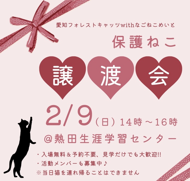| イベント内容 | 日時 2月9日(日) 14時~16時 場所 熱田生涯学習センター 主催 愛知フォレストキャッツwithなごねこめいと 地域猫活動やTNR活動の過程などで 保護した猫たち 子猫もいれば、大人猫もいます 見学、相談だけでも大丈夫! 予約不要、参加費無料なのでお気軽に 猫に関する活動を何かしたい、という方も歓迎です 遊びに来る感覚で、お越しくださいませ 来場者特典!は来てのお楽しみ! ☆猫に関して☆ 各団体の保護主さんごとに決めているお約束事があります ・当日は猫を連れ帰ることはできません ・猫を迎えるにあたり、飼育環境などについて お話しをさせていただきトライアル(お試し飼育) から始めさせていただきます ・2週間前後のトライアル期間を経て、問題ない ようであれば、譲渡契約書を結び正式譲渡と なります ・所定の譲渡費用をいただきます |
