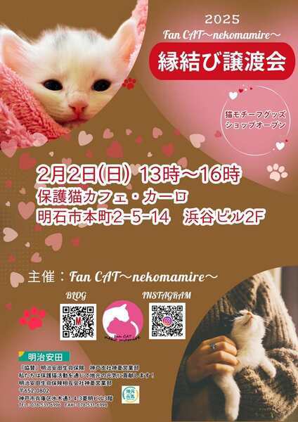 | イベント内容 | 猫の譲渡会 in 明石市 日時 2月2日(日)13時から16時まで(譲渡会参加は無料です) 場所:明石市本町2-5-14 浜谷ビル2階 保護猫カフェ・カーロ 事務所側 (譲渡会のお問合せはカーロさんにしないようにお願いします) Pは近くにコインパーキングがたくさんありますのでご利用お願いします たくさんの猫さんたちが参加しています 可愛い子猫さんも参加していますよ♪ 1週間前くらいから参加猫さんの紹介をしていますのでブログにてご確認ください 本気で猫を飼いたい方是非ご来場ください 早い順ではございませんが早くに決まってしまう場合がございますので お早めにお越しいただくか面会予約をお願いします ※猫の譲渡は無料ではありません(譲渡会参加は無料です) ※当日連れて帰れません ※譲渡条件があります ●参加猫たちのお紹介やお問い合わせ(面会予約等)は ブログまたはInstagramDMよりご連絡お願いします https://mycatkobe.blog.fc2.com/ 主催:Fan CAT~nekomamire~ |