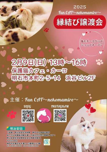 | イベント内容 | 猫の譲渡会 in 明石市 日時 2月9日(日)13時から16時まで(譲渡会参加は無料です) 場所:明石市本町2-5-14 浜谷ビル2階 保護猫カフェ・カーロ 事務所側 (譲渡会のお問合せはカーロさんにしないようにお願いします) Pは近くにコインパーキングがたくさんありますのでご利用お願いします たくさんの猫さんたちが参加しています 可愛い子猫さんも参加していますよ♪ 1週間前くらいから参加猫さんの紹介をしていますのでブログにてご確認ください 本気で猫を飼いたい方是非ご来場ください 早い順ではございませんが早くに決まってしまう場合がございますので お早めにお越しいただくか面会予約をお願いします ※猫の譲渡は無料ではありません(譲渡会参加は無料です) ※当日連れて帰れません ※譲渡条件があります ●参加猫たちのお紹介やお問い合わせ(面会予約等)は ブログまたはInstagramDMよりご連絡お願いします https://mycatkobe.blog.fc2.com/ 主催:Fan CAT~nekomamire~ |