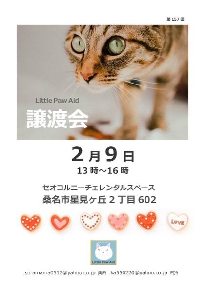 | イベント内容 | 日時 2月9日(日)13時~16時 場所 セオコルニーチェレンタルスペース 三重県桑名市星見ヶ丘2丁目602 猫は少ないですが4ヶ月子猫や成猫のマンチカンも参加します 慣れてない子もゴロゴロの甘えん坊もみんな個性的で可愛いです 猫を飼いたいと思っている方も猫を見てみたいと思っている方もお気軽に遊びに来て下さい それぞれの保護主により譲渡条件があります 当日猫を連れ帰る事はできません。 参加猫は保護主のブログで確認ください。 ◆参加者 リトルパウエイド https://blog.goo.ne.jp/ka550220/e/da0fa7f743a938b9030d35e95e0a0263 http://blog.livedoor.jp/cats_voice_pawaid/ ほんわか猫な日々 https://blog.goo.ne.jp/soramama はるごまいけのブログ http://ameblo.jp/harugoma3futagozaru/ 予約は不要です 連絡先 soramama0512@ezweb.ne.jp 奥田 |