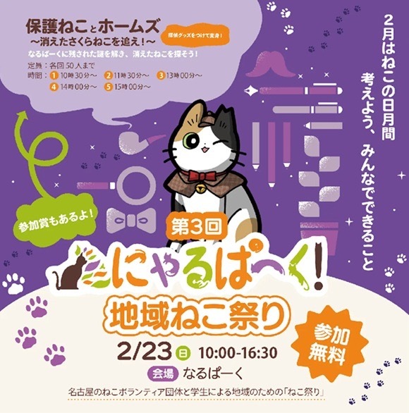 | イベント内容 | 名古屋市緑区にある「なるぱーく」にて、猫まつりを開催! トラックの中で譲渡会も行いますよ ハンディキャップ猫の譲渡会の時間もあります。 事前予約フォームは以下のリンクより https://forms.gle/pFTELyN1j4SzFiS49 気になる猫さんがいたら お問い合わせもお気軽に⭐︎ |