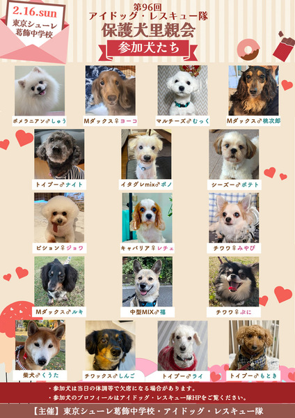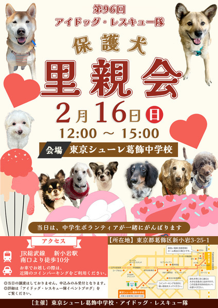| イベント内容 | 第96回アイドッグ里親会(新小岩)のお知らせ 以下の通り、里親会を開催します。 ・日時: 2月16日(日) ・時間: 12:00 ~15:00 ・会場: 東京シューレ葛飾中学校 ・住所:東京都葛飾区新小岩3-25-1 ・アクセス:JR新小岩駅南口より徒歩10分 ※お車でお越しの際は、近隣のコインパーキングをご利用ください。 ※犬をお連れの方は、オムツやマナーベルトをご着用ください。 フリーで遊ばせることは出来ませんので、リードの着用をお願い致します。 【チャリティグッズ販売】 当日会場内にてカレンダー、ボールペン、Tシャツ、 ショルダーリード、カフェマットなどを販売いたします。 〜皆様のお越しをお待ちしています〜 |