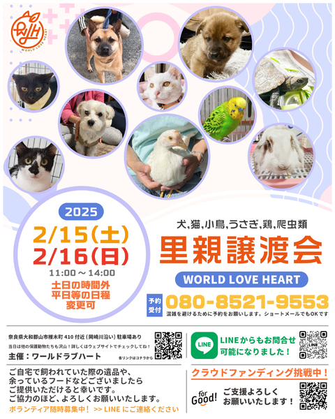| イベント内容 | ワールドラブハートで里親募集中の動物たちの譲渡会を開催します! 犬猫だけではなく、インコやウサギ、チンチラに亀などたくさんの保護動物がいます! みんな新しい家族を探しています。写真だけでは伝えきれない魅力が盛りだくさん! 実際に会ってそのかわいさを実感してください♪ ★里親募集中の動物たち★ https://satoya-boshu.net/foster/?@button_name@=search&FosterParent_MemberID=1161 ★里親募集中の動物たち★ ・犬、猫 ・インコ ・ウサギ ・チンチラ ・ハムスター ・小鳥 ・チャボ ・カメ ……など 子犬や子猫もたくさんいますよ♡ ぜひお気軽にお越しください! ●混雑をさけるために、事前予約をお願いします。 予約番号080-8521-9553 ショートメールでも可♪ ●当日までに譲渡が決定した・体調がすぐれないなど、やむを得ない理由で不参加の場合があります。ご希望の子がいましたら、当日お問い合わせください。 ●当日、その場での引き渡しはしておりません。譲渡決定後、自宅訪問を兼ねてこちらからお届け致します。 ご来場お待ちしております♪ ★world love heart(ワールドラブハート)は、奈良県大和郡山市で活動している動物保護団体です。 『引き取り依頼は断らない』をモットーに、犬、猫、鶏、小動物、家畜、爬虫類など捨てられた動物を保護しています。 https://worldloveheart-nara.jimdofree.com |