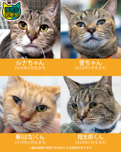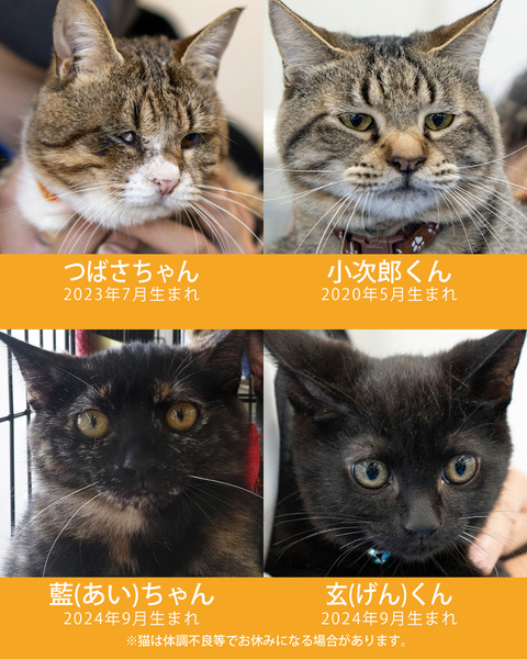 | イベント内容 | 譲渡会参加メンバー24匹決定☆★ 中猫さん!年中さん!年長さん多めです。 穏やか性格の猫さん、2匹目のネコさん、相棒ねこさんなど、 それぞれのお家の生活にあったネコさんを迎えてください。 ▼参加猫▼ http://miyoshineko.sblo.jp/article/191261615.html 【一匹一匹、ご縁つなぎをさせて頂きます】 ■2025年3月2日(日)10時~15時 ■みよし市カリヨンハウス(みよし市三好丘2-2-1) ■無料P48台、大型コインPあり 【参加団体】 NPO法人三好ネコの会 https://www.instagram.com/miyoshineko あいち東郷ねこの会 https://www.instagram.com/togoneko 猫暖心 https://www.instagram.com/nekodangonet 【ご来場前に】 ・猫は先着や申入れの順番ではございません。 ・適正と条件を十分考慮させて頂き、トライアル先は抽選で決まります。 ・当選されたご家庭のみに当日電話連絡を差し上げます。 ・体調不良等で不参加になる猫もございます。 ●子猫譲渡手数料 ワクチン1回接種/1匹20,000円・2匹38,000円 ワクチン2回接種/1匹30,000円・2匹58,000円 ●成猫/オス30,000円・メス35,000円 ※成猫は不妊去勢済、ワクチン済です。 ※個人参加猫、他団体猫は上記手数料ではございません。 主催:NPO法人三好ネコの会 https://miyoshi-neko.jp ◎保護猫一覧 https://miyoshi-neko.jp/foster_parents.html ◎インスタ本館 https://www.instagram.com/miyoshineko ◎インスタ別館 https://www.instagram.com/miyoshi_neko77 <もったいないを保護猫に> ご家庭で余っているフードを譲渡会場でお受け取りできます 買ったけど食べてくれない、飼い猫が亡くなって残ってしまったなど キャットフードドライブにご寄贈をお願いします。 |