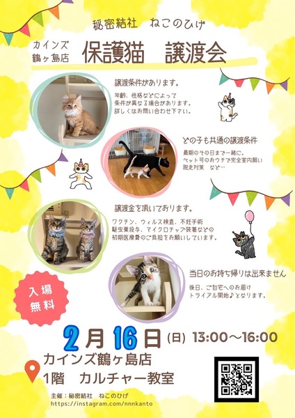 | イベント内容 | 【秘密結社ねこのひげ♡保護猫譲渡会】 2/16(日) 13:00~16:00 埼玉県鶴ヶ島市三ツ木新町1-1-13 カインズ鶴ヶ島店1F カルチャー教室 にて保護猫譲渡会を開催します♪ 純血種多頭遺棄現場よりレスキューできた仔や 昨年生まれの幼猫たちや 脳内はまだまだ仔猫やでー!なオトナ猫が 元気いっぱいで参加します♪ ずっとのご家族さまと 愛し愛されな 両想いになれますように♡ 家族にするなら保護猫だべ♪♪ 新しい家族と笑顔で暮らしたい♪ という方は是非会いにいらしてください♡ ご不明な点がございましたら Instagram @nnnkanto DMにてお問い合わせ下さい☆ |