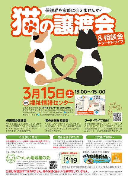 | イベント内容 | 3月15日(土)に「猫の譲渡会&相談会」を開催いたします。 保護猫を迎えたい方はもちろん、猫に関する相談会も同時開催しております。 ご近所との猫トラブルなどでお悩みの方も、どうぞお気軽にお立ち寄りください。 地域貢献の一環として、フードドライブの受付もしております。 ご家庭や職場で余っている食品がありましたらぜひお持ちください! 小さな譲渡会ですが、猫さんも人間も良いご縁を紡げられるよう、のんびり続けています。 遊びにきてくださいね(*^^*) 【日時】3月15日(土)13:00〜15:00 【会場】福祉情報センター ★★★ご注意★★★ 会場は「中央福祉センター」の中ではありません。 その隣の奥まったところにある「福祉情報センター」という小さな建物で開催しております。 お手数ですが、チラシやホームページの地図をご確認の上お越しください。 ★★★★★★★★★ 【入場無料・予約不要】 【主催】にっしん地域猫の会 【ホームページ】https://nissinchiikineko.main.jp ※会場前に駐車場がございますが、数が少ないため、満車時は中央福祉センターの駐車場をご利用ください。図書館のむかいにある市役所の臨時駐車場もご利用いただけます。 ※室内換気のため冷暖房が効きにくい場合がございます。 ※ペット同伴のご入場はできません。 ※猫ちゃんの譲渡には条件がございます。詳細はホームページをご参照ください。 |