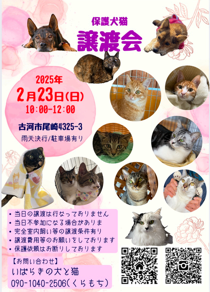 | イベント内容 | 保護犬猫を家族に迎えてみませんか? ずっとのおうちを待っています.* 2025年1回目の譲渡会です! 迎えたい方も会ってみたい方もどなたでも大歓迎です♪ 保護っ子たちとお待ちしております☻ 予約不要/雨天決行/駐車スペース有 (開催場所が分かりにくいので下記の連絡先までご連絡頂ければご案内致します) ※譲渡条件などありますので当会の里親募集ページやHPをご確認ください※ 【不要になったフード(未開封).タオル.ペットシートなどありましたら、ご寄付いただけると助かります】 ⚫︎お問合せ⚫︎ 電話▷090-1040-2506 (クラモチ) LINE ID▷ 717217 (モトハシ) |