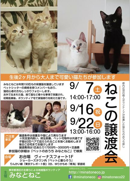 | イベント内容 | 東京都港区を中心に年間150匹以上の譲渡を行なっている、みなとねこがお台場で譲渡会を開催します。 都内近郊のボランティアさんが保護した可愛い子猫たちや飼いやすい大人猫が集合します。 毎月1-2度のペースで開催していましたが9月は3回開催予定です。 おかげさまで毎回素敵なご縁に恵まれております。 8月も30匹以上の猫たちにずっとのお家が見つかりました。 まだまだ子猫がたくさんいます。 参加予定猫はいつでも里親募集中とFacebookページでご紹介します。 https://m.facebook.com/minatoneco/ 是非会いに来てくださいね。 |