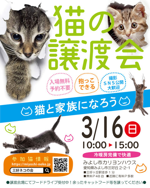 | イベント内容 | 子猫いるよ!大中小21匹!譲渡会参加猫確定!! 10月生まれの子猫います!子猫はあと1-2匹増えるかも!? 激かわ猫、癒し猫で賑やか♪♪ 好きなだけ抱っこできます。 (=^・^=)ねこねこ譲渡会(=^・^=) 3月16日(日)/10時~15時 みよし市カリヨンハウス(みよし市三好丘2-2-1) 無料駐車場48台、近隣に大型コインPあり ※当日は野菜マルシェ様とコラボ開催です。 【参加団体】 NPO法人三好ネコの会 https://www.instagram.com/miyoshineko あいち東郷ねこの会 https://www.instagram.com/togoneko 猫暖心 https://www.instagram.com/nekodangonet 【ご来場前に】 ・猫は先着や申入れの順番ではございません。 ・適正と条件を十分考慮させて頂き、トライアル先は抽選で決まります。 ・当選されたご家庭のみに当日電話連絡を差し上げます。 ・体調不良等で不参加になる猫もございます。 ●子猫譲渡手数料 ワクチン1回接種/1匹20,000円・2匹38,000円 ワクチン2回接種/1匹30,000円・2匹58,000円 ●成猫/オス30,000円・メス35,000円 ※成猫は不妊去勢済、ワクチン済です。 ※個人参加猫、他団体猫は上記手数料ではございません。 主催:NPO法人三好ネコの会 https://miyoshi-neko.jp ◎保護猫一覧 https://miyoshi-neko.jp/foster_parents.html ◎インスタ本館 https://www.instagram.com/miyoshineko ◎インスタ別館 https://www.instagram.com/miyoshi_neko77 <もったいないを保護猫に> ご家庭で余っているフードを譲渡会場でお受け取りできます 買ったけど食べてくれない、飼い猫が亡くなって残ってしまったなど キャットフードドライブにご寄贈をお願いします。 |