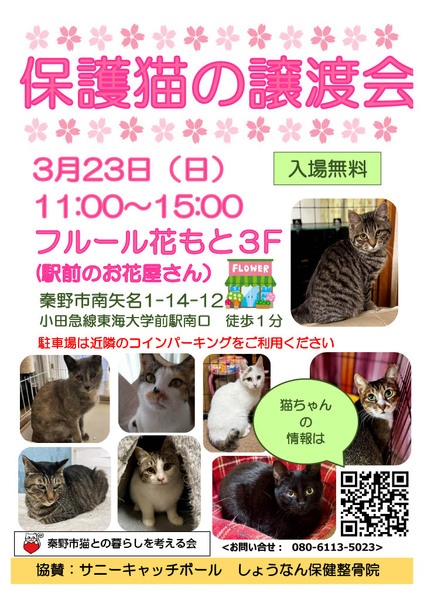 | イベント内容 | 猫の譲渡会を開催いたします。 譲渡会に参加する猫ちゃんは、随時ホームページに掲載していきます。 https://hadanoneko.org/category/recruitment/ 日時:2025年 3月23日(日) 11:00~15:00 会場:フルール花もと 3F 住所:神奈川秦野市南矢名1丁目14-12 アクセス: 電車:小田急小田原線「東海大学前駅」より徒歩2分 車 :国道246号線 桜坂交差点より12分 東名秦野ICより17分 駐車場は近隣のコインパーキングをご利用下さい ● 事前の申し込み等は不要です。 https://hadanoneko.org/joutokai-2025-03-23/ |