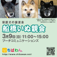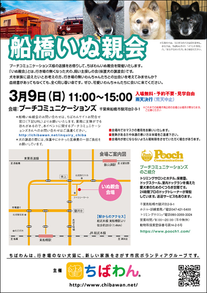 | イベント内容 | 3月船橋いぬ親会のご案内です。 poochさんのご厚意により、プーチコミュニケーションズ(船橋市駿河台)のドッグランをお借りして「船橋いぬ親会」を開催することになりました。 屋根付きのドッグランでの開催になります。 【ちばわんからのお願い】 ①会場内ではマスクの着用をお願いします。 ②発熱がある方や体調が悪い方は来場をご遠慮ください。 ③会場内が密にならないよう入場制限をさせていただく場合があります。 開催日:3月9日(日)11:00~15:00 屋外開催(屋根付きドッグラン) 小雨決行 場所:プーチコミュニケーションズ 千葉県船橋市駿河台2-9-1 【アクセス】 飯山満駅から徒歩約20分 JR東船橋駅から徒歩約20分 県道8号線 吹上交差点~駿河台交差点間にあるファミリーマートの裏手になります。 リサイクルショップとファミリーマートの間の道へ進み、最初のT字路を左折してください。 ※店舗の駐車場は5台分のみとなりますので混雑時にはご利用いただけない場合がございます。 満車の場合はコインパーキングをご利用下さい。 《お知らせ》 ◆会場ではチャリティグッズを販売します 売上金は保護した犬猫の医療費など、 ちばわん活動費として大切に使わせていただきます 《お問い合わせ》 いぬ親会について:http://chibawan.net/inquiry_chiba ※いぬ親会当日はメールが見られません。また、お問い合わせの際は、必ず「具体的な件名」を入れて多数の迷惑メールと区別がつくようにお願いいたします。 ※本イベントに関するPoochさんへのお問い合わせはご遠慮ください。 船橋いぬ親会イベントホームページ https://chibawan.net/event/20250309-funabashi-dog ちばわんホームページ https://chibawan.net/ |