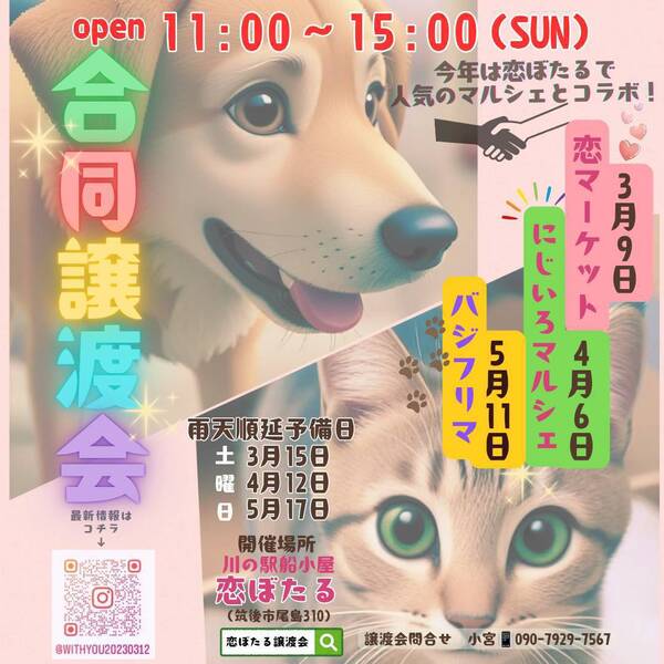| イベント内容 | 1頭でも救いたい! そんな想いで複数の団体さん、個人ボランティアさんと一緒に譲渡会を開催しております! 約50〜100頭のわんちゃんねこちゃんが大集合します?? 沢山の子達が家族との出逢いをお待ちしております。 また沢山の方に知って欲しくてチャリティーマルシェも同時開催✨ 売上の1部をわんにゃんへ頂いてます! 食べてお買い物すれば、わんにゃんの応援にもなります✨ ぜひ飼いたい方も、飼えない方も、誰もが楽しめるイベントとなってますのでお越しください。 わんちゃんと一緒に参加出来るイベントですよ? また食べなかった、使わなかった 大切な遺品などあれば有りがたく頂戴致しますのでお持ち下さい。 タオルや毛布等 フリマ用品等も募集しております。 詳しくはDM下さい。 |