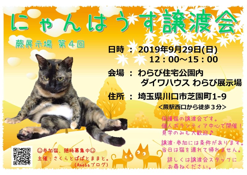 | イベント内容 | 個人ボランティアによる保護ねこ譲渡会です♪ ・JR京浜東北線 蕨駅西口より 徒歩3分 ・場内に駐車場あり 綺麗な住宅展示場室内でのステキな譲渡会です˖✧✧˖° たくさんの猫たちが家族を探してます。 ※猫は当日は連れて帰れません。 アンケートに記入していただき、飼育環境などのお話をさせて頂いたのち、 ご自宅まで伺いトライアルを経てからの正式譲渡となります。 詳しくは下記のブログをご覧ください。 https://ameblo.jp/ayacha-ya/ |