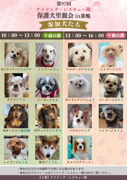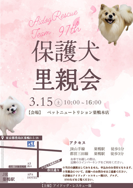 | イベント内容 | 第97回アイドッグ里親会(巣鴨)のお知らせ 以下の通り、里親会を開催します。 ●日時:3月15日(土) 10:00 ~ 16:00 ※入れ替え制 (10:00〜13:00/13:00〜16:00) ●会場:ペットニュートリション巣鴨本店 東京都豊島区巣鴨3-5-18 ●最寄駅 JR山手線 巣鴨駅より徒歩5分 都営三田線 巣鴨駅より徒歩3分 ※お車でお越しの際は、近隣のコインパーキングをご利用ください。 ※会場内は密になりやすいため、マスクの着用は自己責任にてご判断お願いします。 ⚠️犬をお連れの方は、オムツやマナーベルトをご着用ください。 フリーで遊ばせることは出来ませんので、リードの着用をお願い致します。 〜皆様のお越しをお待ちしています〜 |