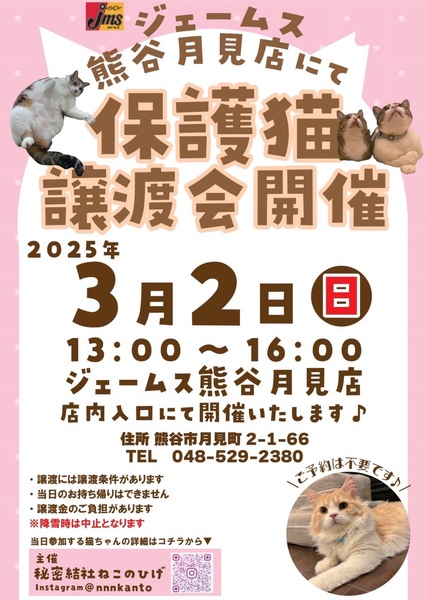 | イベント内容 | 3/2(日)13:00~16:00は♪ ジェームス熊谷月見店 〒360-0825 埼玉県熊谷市月見町2-1-66 にて♪ 秘密結社ねこのひげ 保護猫譲渡会を開催します☆ カー用品を見に来たらば… 保護猫譲渡会をやっててビックリ! (⊙⊙)ファッ!? 車のメンテナンスに来たらば… 保護猫がいぱーーい♪で (*´Д`*)ハァハァ♡ 新しい家族を探しに来たらば… 出逢っちゃった♡ (o・ω[+]ロックオン!! などなど♪ お迎え目的の方はもちろんのこと そうでない方も!! 是非お気軽にお立ち寄りくださいませ☆ (ΦωΦ)ココロヨリオマチシテマース♡ ご不明な点がございましたら インスタグラム @nnnkanto 秘密結社ねこのひげ の DMまでお問い合わせ下さい☆ |