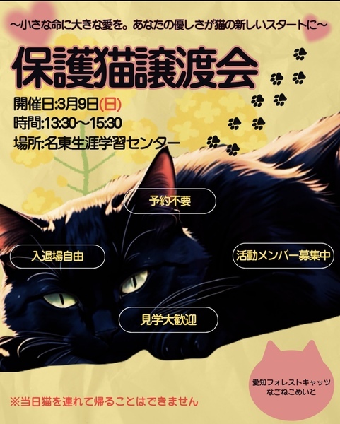 | イベント内容 | 日時 3月9日(日) 13:30〜15:30 場所 名東生涯学習センター 主催 愛知フォレストキャッツwithなごねこめいと 地域猫活動やTNR活動の過程などで 保護した猫たち 子猫もいれば、大人猫もいます 見学、相談だけでも大丈夫! 予約不要、参加費無料なのでお気軽に 猫に関する活動を何かしたい、という方も歓迎です 遊びに来る感覚で、お越しくださいませ |