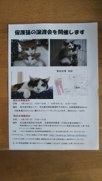 | イベント内容 | 緑区生涯学習センターにて開催致します。 子猫成猫多数参加。 お気軽にお越しください。ご不明な点は下記にお電話ください。 09091932254 |