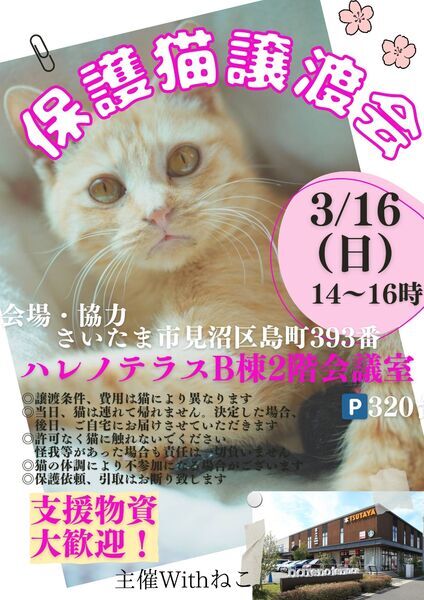 | イベント内容 | おかげさまでハレノテラス保護猫譲渡会6周年目になりました㊗ 「しあわせにゃんこ」候補生が素敵なご縁を待ってます♡ ☆参加予定猫についてはこちらをご覧ください→https://youtu.be/ONS5Vz6AYZg ※当日、猫の体調・里親決定の場合は不参加になる場合がございます 2024年秋以降に生まれた子猫たちもまだまだしあわせにゃんこになる日を待っています さいたま市近郊で活動している個人ボランティアさんが参加する 冷暖房完備の会議室をお借りして区切られたお部屋で ゆっくり猫と触れ合える環境でのアットホームな譲渡会です 大切に育ててきた子猫から大人猫までが参加します 入場は無料です ☆2019年3月より開催しております こちらの会場で しあわせにゃんこになった数は 400匹以上です ☆一匹一匹清潔な環境で丁寧に健康管理に気を付けて育てています※必要医療は全てかけています ☆里親様のご年齢により 高齢の猫の譲渡も行っています ☆初めて猫を飼う方でも不安がないよう アドバイスさせていただきます 【ご支援のお願い】 おうちで購入したけど食べなかったキャットフード・ペットシート・猫砂等ございましたら お持ちいただければ助かる命があります。ご協力お願いいたします 協力・会場 http://hare-terra.com/ ハレノテラスB棟 2階会議室【無料駐車場320台】 所在地 埼玉県さいたま市見沼区島町393番地 交通 【お車でお越しの方】 東大宮バイパスからのルート 東大宮バイパスを進み、「深作中」交差点を曲がり、見沼区島町(ハレノテラス)へ 県道5号線(新産業道路)からのルート 県道5号線を進み、「八雲神社入口」交差点を曲がり、さらに進み「東大宮駅入口」を曲がり、見沼区島町(ハレノテラス)へ※島小学校向かい 【電車でお越しの方】 JR宇都宮線(湘南新宿ライン・上野東京ライン)東大宮駅「東口」下車 駅前通りをまっすぐ徒歩13分 【バスでお越しの方】 JR宇都宮線東大宮駅東口より 国際興業バス「大和田駅行き」3分乗車 「東大宮7丁目」バス停 下車徒歩3分 東武野田線大和田駅 国際興業バス「東大宮駅行き」6分乗車 「東大宮7丁目」バス停下車 徒歩3分 ※お見合いをして 譲渡後希望の場合は会場で申し込みをし 譲渡条件と照らし合わせ 決定の場合は 後日 ご自宅へお届けし 譲渡契約を結んでいただきます ※医療費・光熱費の一部等は 譲渡費用のご負担がございます 次の子の保護に使わせていただきます ※猫の飼育に必要な ゲージなどのご購入・脱走防止対策等をお願いします 主催・お問い合わせ Withねこ https://nekotomo.localinfo.jp Youtube https://www.youtube.com/@withneko2222 Instagram https://www.instagram.com/withneko2222 |