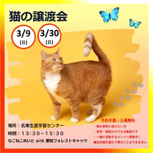 | イベント内容 | 人慣れ抜群の可愛い子達が運命の出逢いを待っています。 個性豊かな保護猫達に会いに来てください。 保護猫飼いたいけど、譲渡会初めてで…と戸惑っていらっしゃる方も気さくなスタッフが対応しますのでご安心ください✨ |