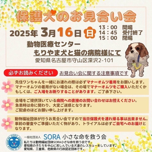 | イベント内容 | 保護犬のお見合い会を開催致します。 先住ワンちゃんを一緒にお連れの際は必ずマナーオムツ着用をお願いします。 マナーオムツの着用がない場合は、その場でマナーオムツをご購入頂くか、もしくは、ご入場をお断りすることがあります。ご了承下さい。 【注意】会場をご提供頂いている病院への直接のお問い合わせはお控えください。急患時は命に関わり、大変ご迷惑となります。ご配慮のほどお願い申し上げます。 もりやま犬と猫の病院さま2階会議室 〒463-0811名古屋市守山区深沢2-101 <ご注意>事前のお申込みは不要です。保護活動ブログで、開催日の数日前に譲渡会参加が決定したワンコたちのご案内もしておりますので、ご希望のワンコの参加をご確認してお越し頂けますと幸いです。 SORA公式ホームページhttps://sora-chiisana.org/foster/ SORA公式活動メインブログhttps://ameblo.jp/sora-chisana-inochi/ SORAイベントブログhttps://ameblo.jp/sora-charity-events/ |
