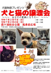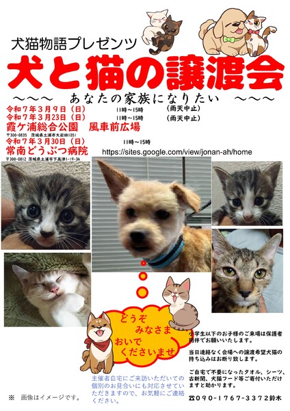 | イベント内容 | 土浦市の霞ヶ浦総合公園で開催しています、 犬と猫の譲渡会です。 毎回、色んなところからの家族を探す犬猫が参加します。 あなたとの出会いを待つワンニャンにぜひ会いにきてくださいませ。 11時~14時開催です ●犬猫物語は土浦を中心とし保護活動、野良猫の避妊去勢などを行っている団体です。 犬猫の相談などはお電話くださいませ。 譲渡会への猫の参加も受け付けております。 当日いきなりの参加は不可能ですが、事前にご連絡ください。 お待ちしています(^^ 問い合わせは09017673372鈴木まで。非通知には出ません。 |