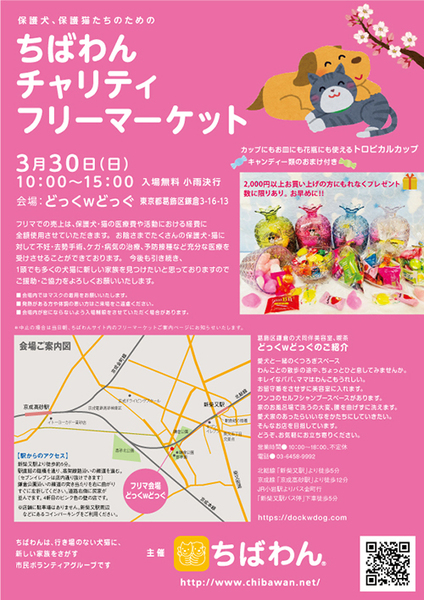 | イベント内容 | 3月30日(日)に葛飾区ドッグカフェ”どっくwどっぐ”にてチャリティフリマを開催することになりました!いぬ親会会場としても利用させて頂いております”どっくwどっぐ”でのチャリティフリマです。 チャリティグッズや全国の皆様がご寄付して下さったフリマ物資を販売させて頂きます! フリマでの売上は、医療費や活動における経費に全額使用させていただいております。おかげさまでたくさんの保護犬・猫に対して不妊去勢手術、怪我や病気の治療、予防接種など、十分な医療を受けさせることができております。今後も引き続き、1頭でも多くの犬猫に新しい家族を見つけたいと思っておりますので、ご援助・ご協力をよろしくお願いいたします。 是非ご家族、お友達と一緒に遊びに来て下さい。思わぬ掘り出し物が見つかるかもしれません! 皆様のご来場をお待ちしています。 【ちばわんからのお願い】 ①会場内ではマスクの着用をお願いします。 ②発熱がある方や体調が悪い方は来場をご遠慮ください。 ③会場内が密にならないよう入場制限をさせていただく場合があります。 【開催日】3月30日 【開催時間】10:00〜15:00 【会場】”どっくwどっぐ”内 【住所】東京都葛飾区鎌倉3-16-13 ※中止の場合は当日に、ちばわんイベントホームページにてお知らせします。 【アクセス】 ≪交通≫ 北総線「新柴又駅」徒歩5分 駅直結の陸橋を渡り、高架線沿いの細道を進みます。(セブンイレブンは店内通り抜けできます)鎌倉公園沿いの細道の突き当りを右に曲がり、すぐに左折してください。道路右側に民家が並んでいます。4軒目のピンク色の壁の店です。 ※店舗には駐車場はありません。当日お車の方は近隣のコインパーキングをご利用ください。 【お知らせ】 今回も今回も2000円以上お買い上げの方に カップにもお皿にも花瓶にも使える トロピカルカップをご用意してます! (キャンディー類のおまけ付き) ※数に限りがあります※ どうぞお楽しみに (^o^) チャリティーフリマイベントホームページ https://chibawan.net/event/20250330-flea-market-katsushika ちばわんホームページ https://chibawan.net/ |