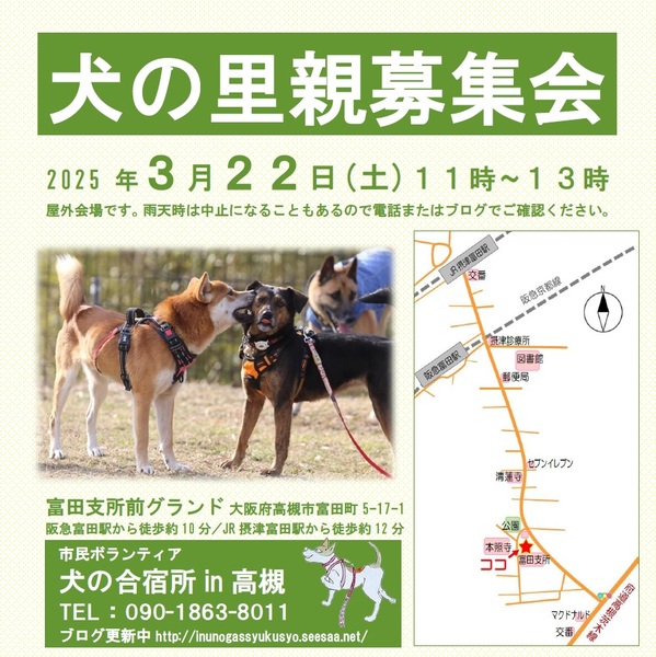 | イベント内容 | ※屋外会場での里親募集会です。 雨天時は中止にする可能性がありますので電話でご確認ください。 犬によっては別会場をご案内できる場合があります。 (電話でのお問合せ→090-1863-8011) ※先住ワンちゃんを連れて会いに来て頂けます。相性を見るためにも、是非是非、連れてきてください。 ※近付きましたら「犬の合宿所in高槻」のブログでも参加予定犬等の情報を紹介していきます。 ➡ http://inunogassyukusyo.seesaa.net/article/511062819.html 予約は不要ですが、参加犬が直前に変更する場合がありますので、特に会いたいワンちゃんが決まっている場合は事前にご確認頂く方が確実かと思います。 【お問合せ】 090-1863-8011 ・・・・・・・・・・ 【アクセス】 ・阪急京都線 富田駅から徒歩約10分 ・JR京都線 摂津富田駅から徒歩約12分 ※隣接する富田支所と公民館の駐車場は使えませんが、会場広場内に駐車できる場合があります。 事前にご確認ください。(090-1863-8011) ・・・・・・・・・・ 市民ボランティア「犬の合宿所in高槻」は、現地での譲渡が難しい離島の保健所収容犬を引き取り関西で新しい飼い主探しをしています。 保護犬を家族として迎えることが文化として定着し、生体販売に伴う悲惨な繁殖犬の存在がなくなることを願っています。 ・・・・・・・・・・・・・・・・・・・・・・・・・・・・・ ★ 一時預かりさんや犬の搬送ボランティアさん、里親募集会の当日お手伝いの方など常時募集しています。 ★犬によっては個別お見合いできる場合があります。 里親募集会に参加できない方で個別お見合いをご希望の方は、預かりさんとの日程調整が必要ですので、電話でお問合せください。⇒090-1863-8011 |