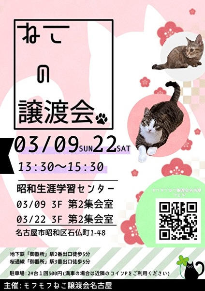 | イベント内容 | モフモフねこ譲渡会名古屋 猫たちの幸せなお家探しのために譲渡会を開催しております。 個人ボランティアの集まりです。 自分たちの出来ることから頑張っております! 一匹でも幸せになれる猫が増えますように 場所 昭和生涯学習センター 第2集会室 住所 名古屋市昭和区石仏町1-48 時間 13時30分~15時30分 交通機関等 地下鉄「御器所」鶴舞線2番出口南約300m 桜通線3番出口南東約300m 駐車場24台(満車の場合は近隣コインPをご利用ください) 参加猫の情報は下記モフモフねこ譲渡会名古屋ブログにてご確認ください。 https://mofumofuneko4.fc2.net/ 【譲渡会について】 ・譲渡会は入場無料、予約不要です。お気軽にご参加ください。 ・会場へのお問い合わせはご遠慮ください。 ご質問は下記メールアドレスへお願いいたします。 mofumofuneko4☆gmail.com ☆を@に変更してお問い合わせください。 ・猫の引き取りはしておりません。 ・譲渡会当日に猫をお渡しすることはありません。 ・保護主によって譲渡条件が違う場合があります。 ・参加予定でも譲渡会前にトライアルになる場合があります。 ご希望の猫がいましたらまずはお問い合わせをお願いいたします。 【参加猫について】 ・ノミ駆除、駆虫、トイレ躾、ワクチン3種接種済。 ・年齢や健康状態に応じて、避妊手術を行っております。 ・参加予定で紹介していても当日体調不良等で欠席になる場合があります。 【譲渡の約束事】 ・ペット飼育可の住宅にお住まいの方。 ・完全室内飼育。 ・脱走防止の対策をしていただける方。 ・避妊手術未実施の場合、避妊手術 の実施と報告をしていただける方。 ・ご家族全員が猫を飼うことに同意していること。 ・譲渡後、しばらく定期連絡を入れていただける方。 *お一人暮らしの方、60歳以上の方は、身内の方の保証が必要となる場合がございます。 #名古屋昭和区 #昭和生涯学習センター #譲渡会 #保護猫 #地域猫 #さくらねこ #tnr #里親募集 #里親募集中 #猫 #ねこ #殺処分ゼロ #買わずに飼おう #モフモフねこ譲渡会名古屋 #ペットショップに行く前に #譲渡会のお知らせ #猫と暮らしたい |