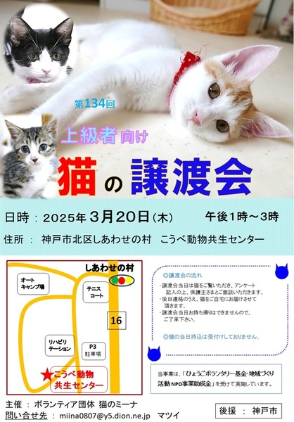 | イベント内容 | 上級者向き&大人猫さん&色んな猫さん の集まった譲渡会です。 猫の家族を探しに来て頂ければと思います。 ペット不可にお住まいの方はご遠慮ください。 (今一度ご確認の上、お越しください。) 今回は神戸市の しあわせの村 にある、こうべ動物共生センター で開催します。 時間は同じ、午後1時~3時です。 行き方は、各乗り場からバスで 『しあわせの村行』・車でお越しの場合は P3 パーキングが最寄です。 |