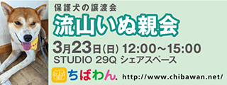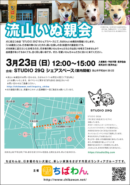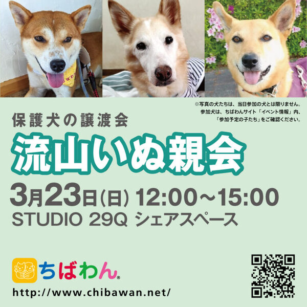 | イベント内容 | “STUDIO 29Q”にて流山いぬ親会を開催いたします。 飼い主探しをしている保護犬達に会いにきてみませんか。 ※いぬ親会見学は予約等必要ありません。無料でどなたでも入場できます。ただし、混雑を避けるために入場制限をさせていただく場合があります。 ※ネットによる募集も平行して行っているため、参加予定の犬が当日までに決定・不参加となる場合もあります。 ※イベントバナーに写真が掲載されている犬が参加するとは限りません。参加犬は本サイトに順次掲載されますのでそちらをご確認ください。 開催日:3月23日(日)12:00~15:00 室内開催:雨天決行 (荒天中止) 場所:STUDIO 29Q シェアスペース(2階) 千葉県流山市平和台4-36-22 【会場アクセス】 流鉄流山線「平和台駅」下車。踏切を渡り200m程直進、左側交差点角。駅より徒歩約3分。 駐車場はございません。当日お車の方は近隣のコインパーキングをご利用ください。 【注意事項】 《ご来場される皆様へのお願い》 臆病な性格の犬や、子供さんを苦手とする犬も参加しています。いきなり触ったりせず、まずボランティアに声をかけてください。 お子様と一緒にご来場される際には、手を繋ぐなどして頂き、お子様だけで参加犬に近づくことのないようご注意ください。 ※会場に同伴される犬には、必ずリード(引き綱)をつけてください。 【お知らせ】 ◆会場ではチャリティグッズを販売します ◆ミニフリマで、お得な犬猫グッズの販売もあります。 【お問い合わせ】 いぬ親会について:https://chibawan.net/inquiry_chiba ※いぬ親会当日はメールが見れません。また、お問い合わせの際は、必ず「具体的な件名」を入れて多数の迷惑メールと区別がつくようにお願いいたします。 流山いぬ親会イベントホームページ https://chibawan.net/event/20250323-nagareyama-dog ちばわんホームページ https://chibawan.net/ |