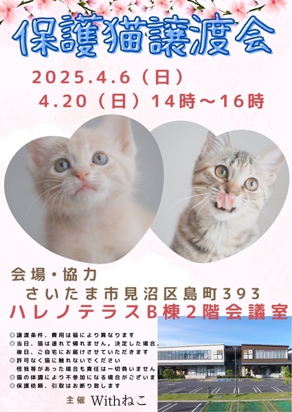 | イベント内容 | 6周年目も素敵なご縁でいっぱい「しあわせにゃんこ」になりますように♡ ☆参加予定猫についてはこちらをご覧ください→https://youtu.be/QzEpDOHbH_A ※当日、猫の体調・里親決定の場合は不参加になる場合がございます 2024年秋以降に生まれた子猫たちもまだまだしあわせにゃんこになる日を待っています さいたま市近郊で活動している個人ボランティアさんが参加する 冷暖房完備の会議室をお借りして区切られたお部屋で ゆっくり猫と触れ合える環境でのアットホームな譲渡会です 大切に育ててきた子猫から大人猫までが参加します 入場は無料です ☆2019年3月より開催しております こちらの会場で しあわせにゃんこになった数は 400匹以上です ☆一匹一匹清潔な環境で丁寧に健康管理に気を付けて育てています※必要医療は全てかけています ☆里親様のご年齢により 高齢の猫の譲渡も行っています ☆初めて猫を飼う方でも不安がないよう アドバイスさせていただきます 【ご支援のお願い】 おうちで購入したけど食べなかったキャットフード・ペットシート・猫砂等ございましたら お持ちいただければ助かる命があります。ご協力お願いいたします 協力・会場 http://hare-terra.com/ ハレノテラスB棟 2階会議室【無料駐車場320台】 所在地 埼玉県さいたま市見沼区島町393番地 交通 【お車でお越しの方】 東大宮バイパスからのルート 東大宮バイパスを進み、「深作中」交差点を曲がり、見沼区島町(ハレノテラス)へ 県道5号線(新産業道路)からのルート 県道5号線を進み、「八雲神社入口」交差点を曲がり、さらに進み「東大宮駅入口」を曲がり、見沼区島町(ハレノテラス)へ※島小学校向かい 【電車でお越しの方】 JR宇都宮線(湘南新宿ライン・上野東京ライン)東大宮駅「東口」下車 駅前通りをまっすぐ徒歩13分 【バスでお越しの方】 JR宇都宮線東大宮駅東口より 国際興業バス「大和田駅行き」3分乗車 「東大宮7丁目」バス停 下車徒歩3分 東武野田線大和田駅 国際興業バス「東大宮駅行き」6分乗車 「東大宮7丁目」バス停下車 徒歩3分 ※お見合いをして 譲渡後希望の場合は会場で申し込みをし 譲渡条件と照らし合わせ 決定の場合は 後日 ご自宅へお届けし 譲渡契約を結んでいただきます ※医療費・光熱費の一部等は 譲渡費用のご負担がございます 次の子の保護に使わせていただきます ※猫の飼育に必要な ゲージなどのご購入・脱走防止対策等をお願いします 主催・お問い合わせ Withねこ https://nekotomo.localinfo.jp Youtube https://www.youtube.com/@withneko2222 Instagram https://www.instagram.com/withneko2222 |